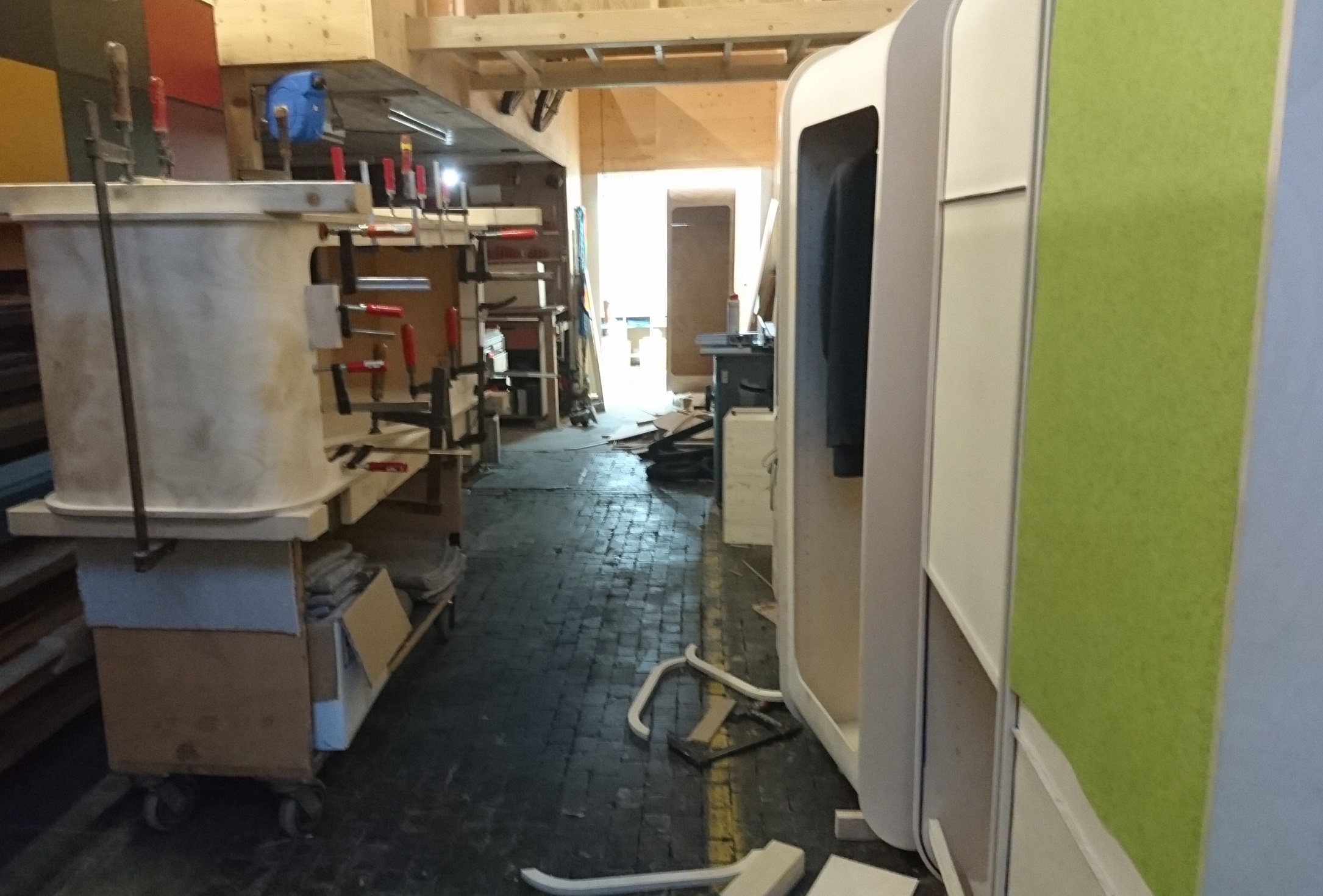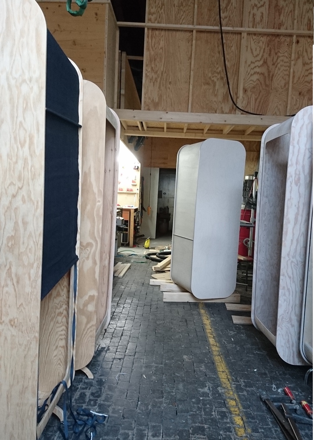 Die Vorhangschiebetür aus reiner Merinowolle gleitet sanft über eine Folie. Ihre weiche Oberfläche schluckt den Schall.