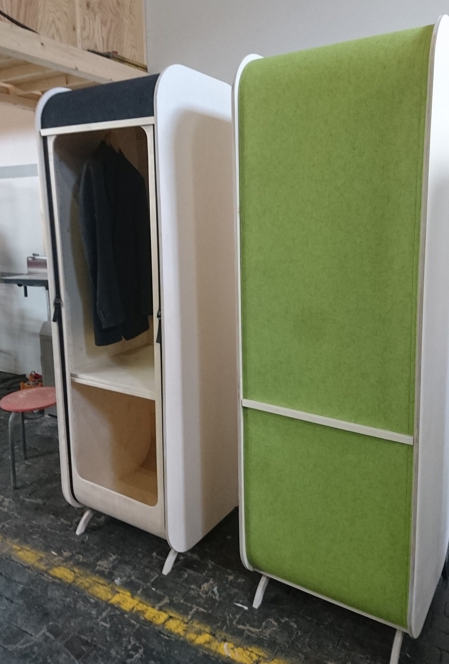 Schrank komplett: 1 Einlegeboden, 1 Kleiderstange, Sockel und Vorhangschiebetür aus Wollfilz. Abmessungen 62 x 197 x 62 cm. | . |