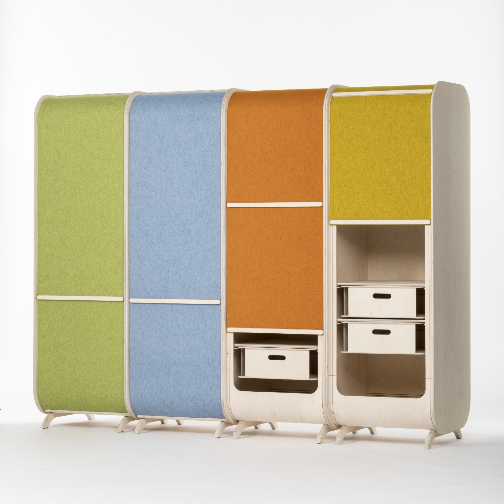 Der Schrank kann freistehend im Raum oder fusslos an der Wand positioniert werden. Die Elemente lassen sich beliebig zusammenstellen.